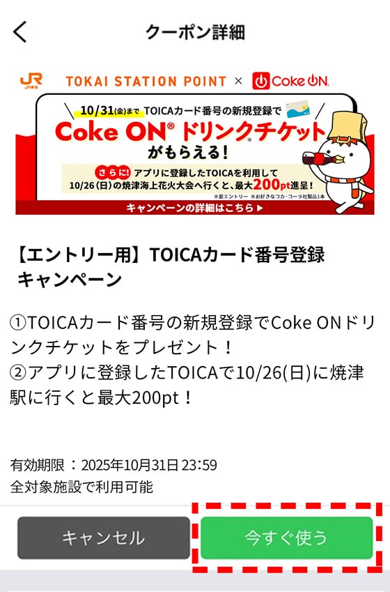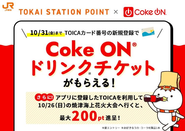10月17日(金)~10月31日(金)の期間にTOKAI STATION POINTアプリにTOICAカード番号を新規登録いただいた方に、もれなくCoke ON®ドリンクチケットを1枚プレゼントいたします。