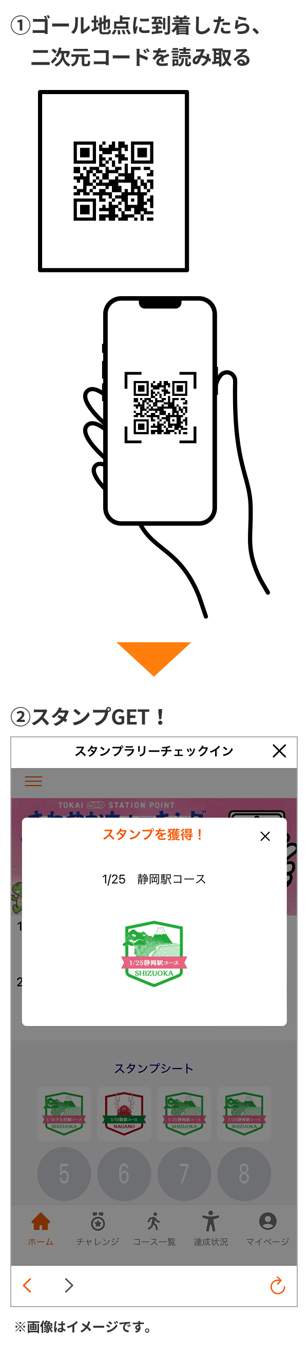 さわやかウォーキングのゴール地点に設置されている二次元コードを読み取り、コーススタンプを獲得しよう! コーススタンプを1個以上集めるだけで、抽選でTOKAI STATION POINTが当たる!