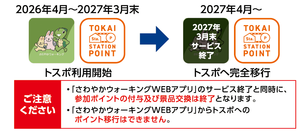 「さわやかウォーキングWEBアプリ」は2027年3月末にサービスを終了し、同機能は「TOKAI STATION POINT」へ順次移行されます。