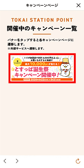 - 対象店舗はTOKAI STATION POINT(トスポ)加盟店一覧の各加盟店のサイトからご確認ください。