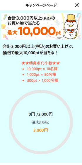 キャンペーン期間中、合計3,000円(税込)以上のお買い物をすると、抽選で以下の特典ポイントが当たる!