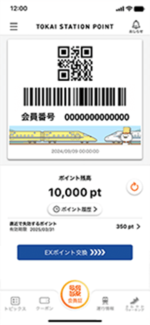 交換可能ポイントにはTOKAI STATION POINTの基本ポイントとEXポイント(基本)のポイント数のみ表示されます。TOKAI STATION POINTの期間限定ポイントとEXポイント(限定)のポイント数は含まれません。