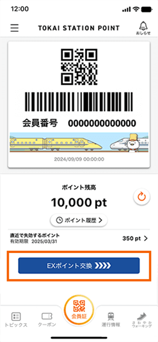 会員証の画面から「EXポイント交換」のボタンをタップします。