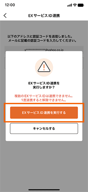 EXサービスに登録済みのメールアドレスに認証コードが送信されるので、その認証コードを入力して「連携する」をタップします。