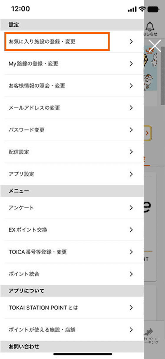 アプリメニューから「お気に入り施設の登録・変更」をタップします。