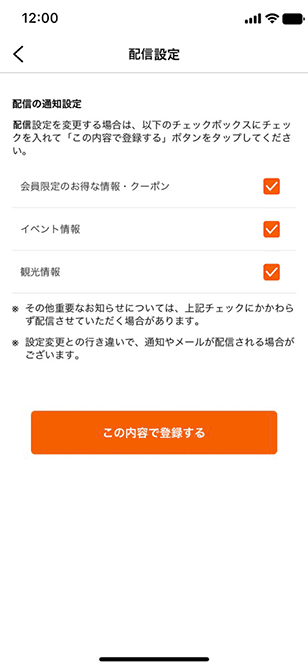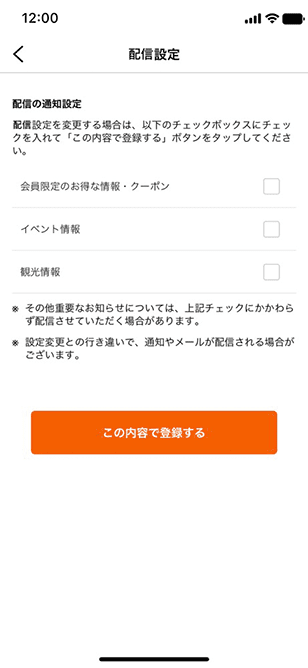 配信を受け取りたい項目にチェックを入れて、「この内容で登録する」のボタンをタップすれば、設定が保存されます。