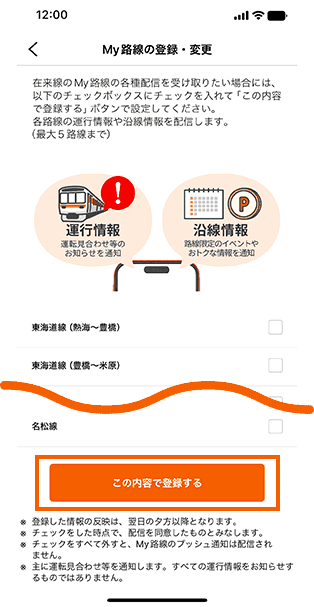 在来線のMy路線の各種配信を受け取りたい路線にチェックを入れ、「この内容で登録する」をタップします。