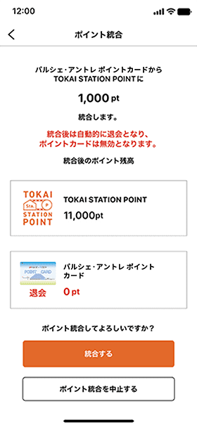 TOKAI STATION POINTに統合するポイント数と、統合後のポイント数が表示されますので、確認して「統合する」のボタンをタップします。
