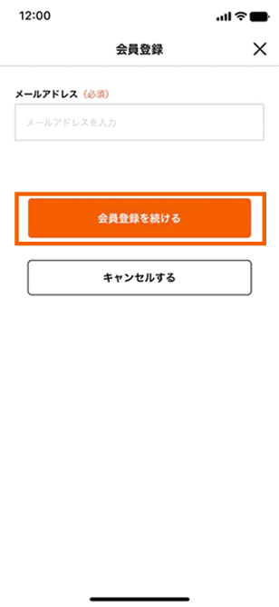 アプリに登録するご自身のメールアドレスを入力して、「会員登録を続ける」をタップします。