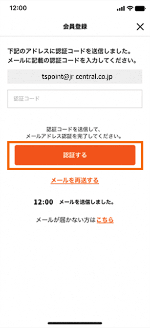 入力したメールアドレスに認証コードが送信されるので、その認証コードを入力して「認証する」をタップします。