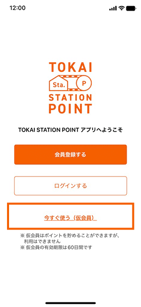 アプリを起動して、「今すぐ使う(仮会員)」のテキストをタップします。