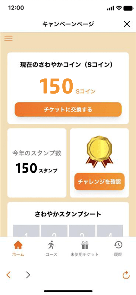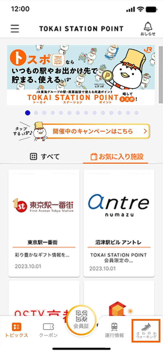 ホーム画面下部に表示される「さわやかウォーキング」のボタンをタップします。
