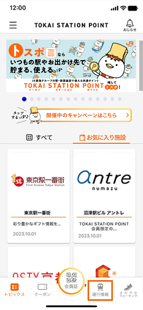 ホーム画面下部に表示される「運行情報」のボタンをタップします。