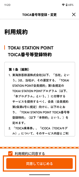 「利用規約に同意する」のチェックを付けて、「同意してはじめる」のボタンをタップします。