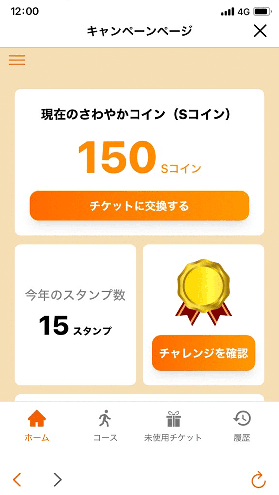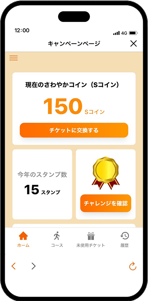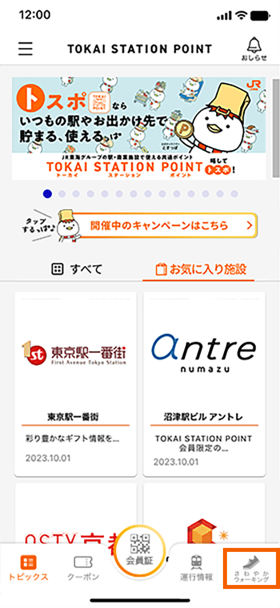 ホーム画面下部に表示される「さわやかウォーキング」のボタンをタップします。